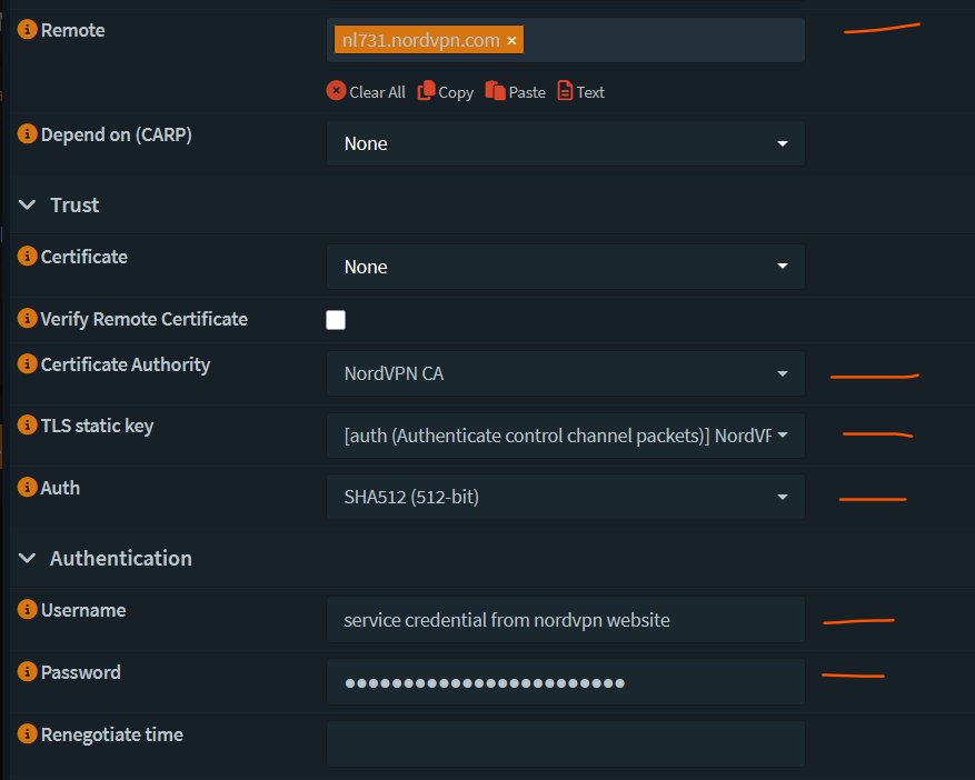 - Import NordVPN CA certificate into the list of Trust Authorities (System > Trust > Authorities). Click on the + sign. Copy the CA certificate from the downloaded config file into the certificate data field.