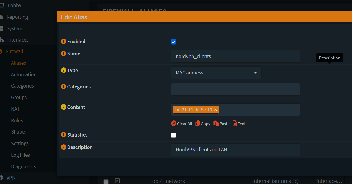 - Add an alias to represent the clients that need to be routed over the VPN tunnel. (Firewall -> Aliases -> click on + sign)
