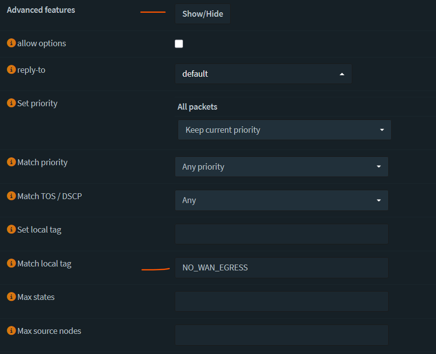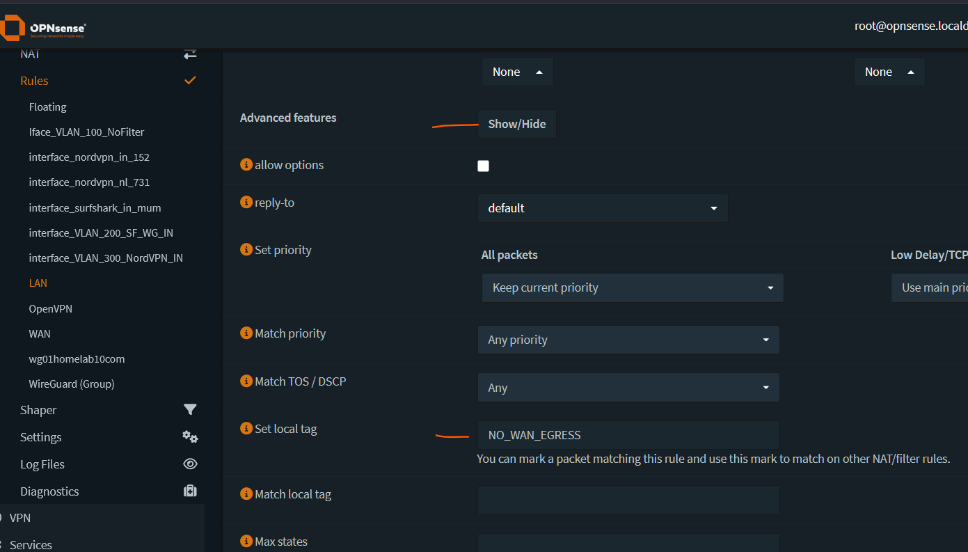 - Configure a killswitch to drop traffic if the VPN connection drops. To do that, add a firewall rule on the WAN interface to drop all packets with a local_tag of NO_WAN_EGRESS.