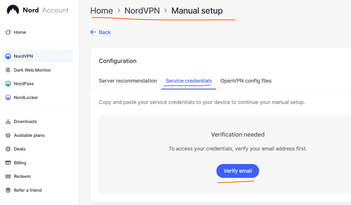 - Retrieve the NordVPN service credentials (username, password) from the website. NordVPN requires you to verify the email using a one-time code before the service credentials can be retrieved.